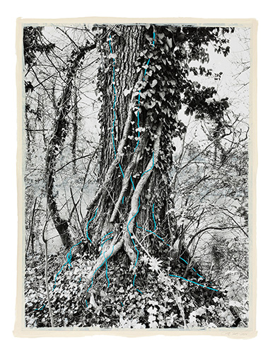 Auch bei Regina Anzenberger verschmelzen Realität und Fiktion in Form von Übermalungen und Überlagerungen. Sie fusioniert ihre Schwarz-Weiß-Fotografien mit verschiedenen Naturmaterialien und lässt durch Malerei und Schrift neue Erzählstränge entstehen. In ihrer Serie Shifting Roots erzählt sie von den Ursprüngen, vom Weitergehen, von Anfängen und Enden, von permanenter Veränderung, dem Lauf des Lebens und dem Generationenwechsel. Sie stellt Fragen des Seins, des Kommens und Gehens.