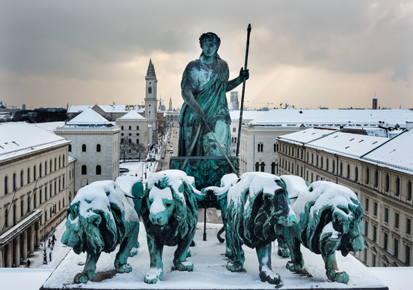 Foto Rainer Viertlböck „Bavaria mit Löwen im Schnee“, ausgestellt in der Architekturgalerie Türkenstraße Türkenstraße 30, München