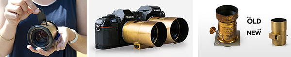 Das neue Petzval Objektiv mit Blendenschieber (links), an Nikon und Canon Kameras sowie im Vergleich mit dem Original.