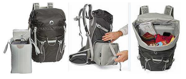 Der Photo Sport Pro 30L AW von Lowepro empfiehlt sich für größere Foto Touren. Er ist mit einem herausnehmbaren Ultra-Cinch™ Kamerafach (29 x 15,5 x 17 cm) ausgestattet, das Platz für eine Pro-DSLR mit Batteriegriff und angesetztem Objektiv (bis 70-200mm f/2.8), einen Blitz und Zubehör bietet. Das Fach kann komprimiert werden, um die Kamera zu fixieren und vor Stößen und Erschütterungen zu schützen. Für den schnellen Zugriff auf die Kamera wird die Tasche über die Seite nach vorne gezogen und über den seitlichen Reißverschluss das Kamerafach geöffnet. Dazu muss der Fotorucksack nicht abgestellt werden.
