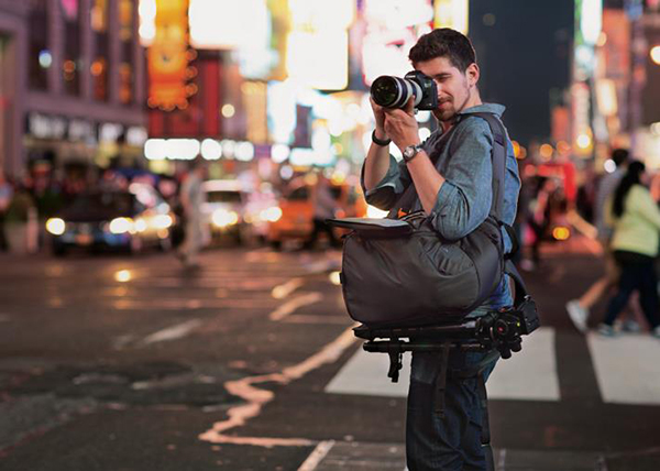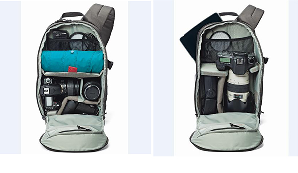 Auch hier funktioniert der schnelle Zugriff über die Seite: der rechte Schultergurt wird einfach abgestreift und die Tasche über den linken Gurt nach vorne gezogen. Eine Trennwand unterteilt den Innenbereich in zwei Fächer. Unten wird die Kameraausrüstung verstaut und oben ist Platz für persönliche Gegenstände und Zubehör, wie Smartphone, Objektivdeckel, Kabel, Speicherkarten. Die Trennwand lässt sich wegklappen und durch eine Kamerahalterung ersetzen. Beide Modelle verfügen an ihren Außenseiten über eine Stativhalterung. Ein weiteres Fach auf der Rückseite bietet bei der Sling-Variante Platz für einen 10“ Tablet PC und bei dem Rucksack für ein 15“ Notebook.