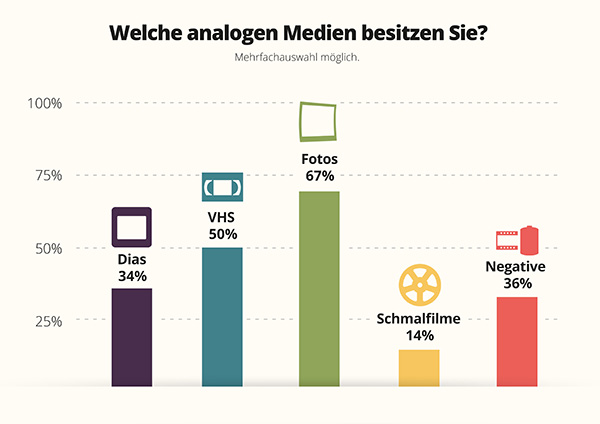 So gaben 81 Prozent der Befragten an, trotz der Marktdurchdringung von Digitalkamera, Smartphone und Tablet noch viele analoge Medien aller Art zu besitzen. Im Schnitt lagern über 500 Dias, fast 1.000 Fotos und Negative und mehr als 50 Videokassetten in jedem der Haushalte. In 15 Prozent der Fälle existieren sogar noch Schmalfilme im heimischen Archiv.