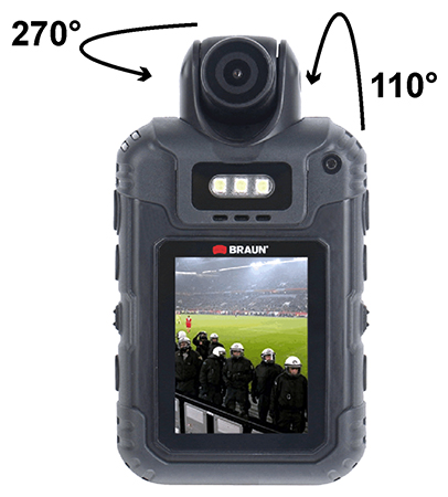 Am Körper getragene Kameras sollen die Zahl der Angriffe auf Polizisten und andere Sicherheitskräfte verringern. Durch ihr spezielles Rotating Lens Design besitzt die Braun Bodycam eine wichtige Funktion, die zur Deeskalation in Konfliktsituation beiträgt, indem die Kamera auch mit der Displayanzeige nach vorn verwendet werden kann. So haben erste Einsätze gezeigt, dass das Konfliktpotenzial abgeschwächt wird, sobald sich die beteiligten Personen selbst im Monitor sehen.