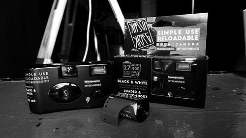 Perfekt passend zum monochromatischen Look der Gruppe hat Lomography die „Simple Use Reloadable Filmkamera“ KITSCHKRIEG Lomography Edition schon mit einem Schwarz-Weiß-ISO-400-Film geladen.