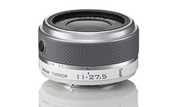 Der Brennweitenbereich des 1 NIKKOR 11-27,5 mm 1:3,5-5,6 entspricht entspricht 30–74 mm bei Kleinbild. Mit einer Drehung des Objektivs schaltet sich die Kamera ein, durch Einziehen des Objektivs wird sie ausgeschaltet. Das neue Objektiv ist in Schwarz und Weiß oder als Teil eines Kamera-Objektiv-Kits in der zur Kamera passenden Farbe erhältlich.