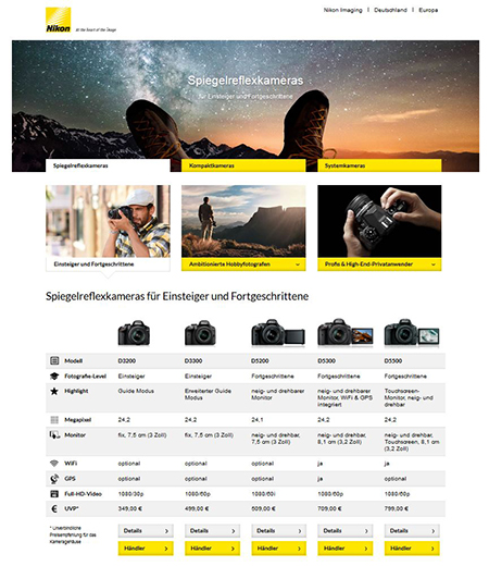 Führen direkt zur Händlersuche: Die Nikon Produktseiten.