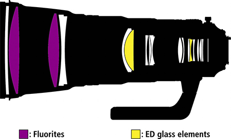 Das neue optische System umfasst insgesamt 16 Linsen in 12 Gruppen, einschließlich je zwei Fluorit- und ED-Glas-Linsen. Die beiden Fluoritlinsen sind ganz vorn im Objektiv eingesetzt und wesentlich leichter als Linsen aus anderen optischen Gläsern. Dies trägt zum geringen Gesamtgewicht des Objektivs und zu einer besonders günstigen Lage der Schwerpunks näher am Bajonettanschluss bei. Die Fluoritlinsen besitzen mit einer besonders geringen Dispersion zudem ähnliche optische Eigenschaften wie Super-ED-Glas, wodurch eine exzellente Korrektur von Farbfehlern ermöglicht wurde. Nikons Nanokristallvergütung sorgt für eine hohe Brillanz mit äußerst geringem Streulicht und minimalen Geisterbildern. Eine Beschädigung der Frontlinse wird durch ein Meniskusschutzglas praktisch ausgeschlossen. Dieses Schutzglas verfügt auf seiner Außenfläche über eine spezielle wasser- und schmutzabweisende Fluorvergütung, die gleichzeitig eine robustere Oberfläche schafft. Das Objektiv verfügt über einen Einschubfilterhalter und wird mit einem NC-Klarglasfilter geliefert.