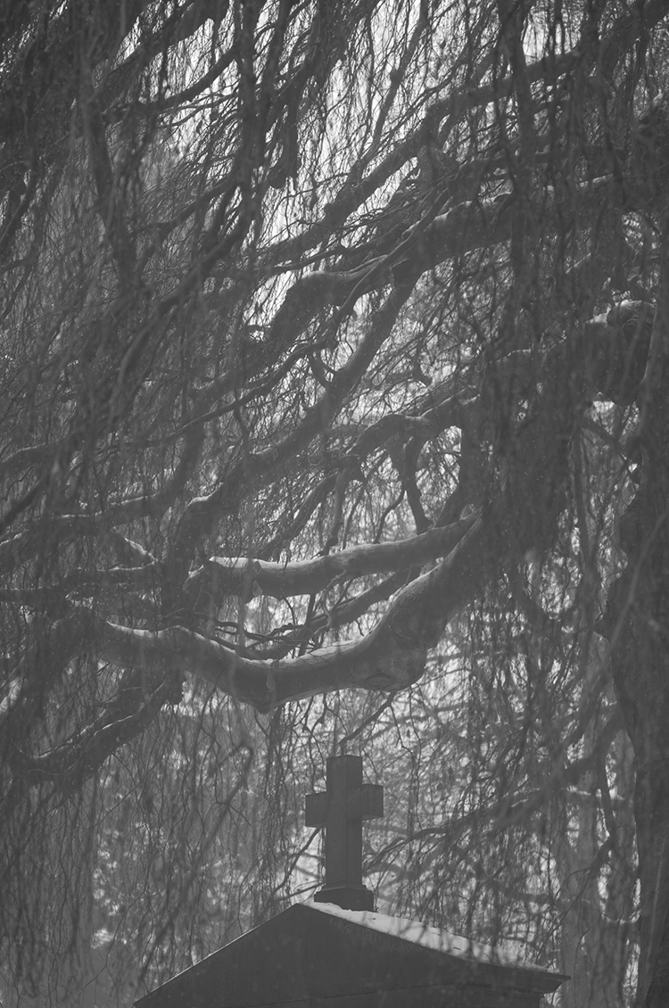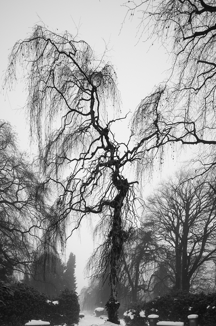 Dieser kontemplative Aspekt seiner Fotos schlägt sich besonders in den jüngsten Friedhofsbildern nieder. Motive, die ihn neuerdings immer wieder aus dem Gestrüpp in eine komfortablere, ruhigere Welt locken, in der die Bäume Trauer tragen.