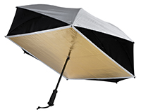 Als Reflektor: Bei umgedrehter Schirmkappe lassen sich verschiedenfarbige Reflektorfolien befestigen, die zum Aufhellen oder Abschatten beispielsweise bei Porträt- oder Makroaufnahmen eingesetzt werden können. Die Reflektorfolien gibt es in den Farben Sunlight, Silber, Gold, Weiß und Schwarz. Die Befestigung der Folien ist kinderleicht, sie werden einfach mit Ösen befestigt und sind blitzschnell einsatzbereit. Sie sind absolut plan und liefern ein gleichmäßiges Licht, dort wo es benötigt wird.