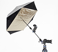 Zunächst ist er wie ein herkömmlicher Regen- bzw. Sonnenschirm zu verwenden. In der mitgelieferten Hülle lässt er sich bequem umhängen und transportieren. Er schützt nicht nur vor Regen und hat einen UV-Schutz von 50+ sondern kann durch die mitgelieferten Halterungen einfach am Fotorucksack befestigt und ‚handsfree‘ getragen werden. Dabei lässt sich die Höhe durch den Teleskopauszug variieren. Da die Hände frei bleiben kann ohne Einschränkungen weiter fotografiert werden. Mit dem zugehörigen Systemzubehör lässt sich der Schirm auch am Stativ befestigen und bietet so optimalen Regen- und Sonnenschutz für Fotograf und Equipment.
