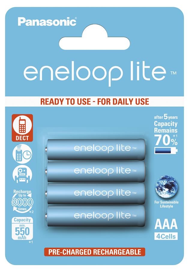 Als Einstiegsmodell sind Akkus der eneloop lite Serie ideal für Anwendungen mit geringem bis mittlerem Energiebedarf. Dazu zählen beispielsweise Schnurlostelefone (DECT) oder Fernbedienungen. eneloop lite verfügt in der Größe Mignon (AA) über eine Kapazität von bis zu 1.000 mAh, in der Größe Micro (AAA) bis zu 600 mAh.