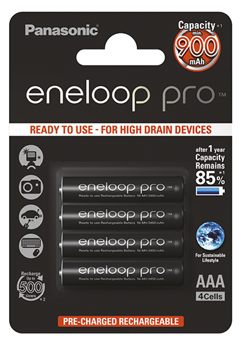 Die Premium Linie eneloop pro eignet sich besonders für Anwendungen mit hohem Energiebedarf wie beispielsweise in Blitzgeräte, Spielzeug, kabellose Computertastaturen, Computer-Mäusen, Gamepads oder batteriebetriebenen Haushaltsgeräten. eneloop pro verfügt in der Größe Mignon (AA) über eine Kapazität von bis zu 2.550 mAh, in der Größe Micro (AAA) bis zu 950 mAh.