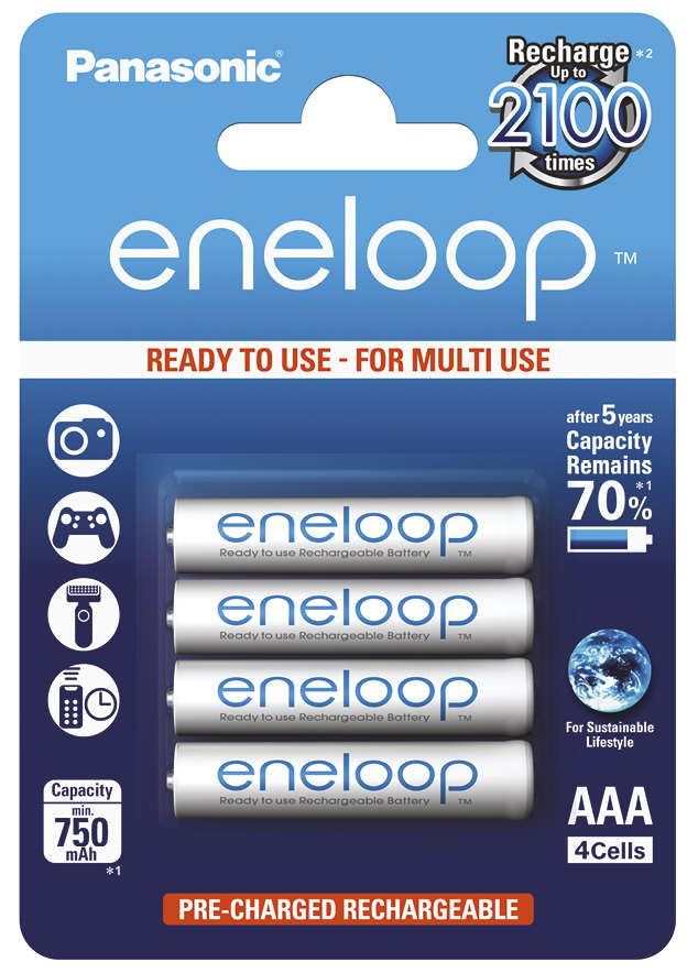 Panasonic eneloop-Akkus sind mit „grüner“ Energie vorgeladen, die von Solarmodulen erzeugt wurde. Der Strom wird mit modernen Photovoltaik-Anlagen in Japan gewonnen. Damit steht eneloop für einen nachhaltigen Lebensstil. Der Akku ist nach dem Kauf direkt einsatzbereit und verfügt über eine geringe Selbstentladung. Während herkömmliche Akkus ihre Ladung verlieren, verfügt eneloop auch nach fünf Jahren Lagerzeit noch über 70 Prozent seiner vorgeladenen Energie. Akkus müssen im Gegensatz zu Primär-Batterien seltener entsorgt werden. Sie sind somit umweltfreundlicher. Durch die hohe Anzahl von bis zu 2.100 Ladezyklen kann ein eneloop-Akku 2.100 Primärbatterien ersetzen. Damit ist eneloop nicht nur besonders umweltfreundlich, sondern auch wirtschaftlich.