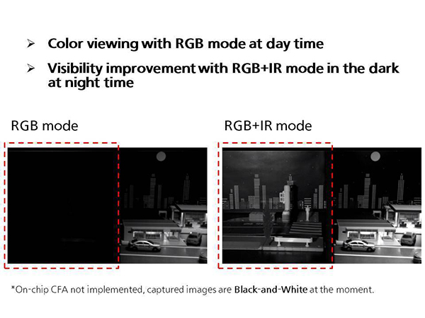 Die Empfindlichkeit aller Pixel im Bildsensor, in dem organische Filmschichten direkt gestapelt sind, wird simultan durch Änderungen der an den Filmschichten angelegten Spannung gesteuert. Über diese Technologie kann zwischen den Modi der Farb-Bildgebung und der NIR-Bildgebung umgeschaltet werden, ohne dass – wie bei herkömmlichen Bildsensoren – mechanisch ein IR-Filter eingesetzt werden muss. Dadurch können Kamerasysteme verkleinert und ihre Stabilität erhöht werden. Über diese Technologie ist auch der globale Shutter-Betrieb möglich. Deshalb eignen sich diese Sensoren fauch speziell für Anwendungen in verschiedenen Bereichen wie beispielsweise maschinelles Sehen oder intelligente Transportsysteme bei denen eine schnelle und präzise