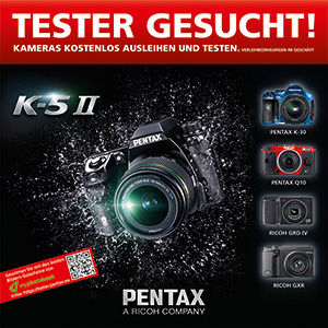 Mit der europaweit angelegten Test-Aktion sucht Pentax Ricoh Imaging eine neue Form im Kundendialog. Interessierte Fotofreunde können sich bei teilnehmenden Fachhändlern die Spiegelreflex-Modelle Pentax K-5 II und Pentax K-30, die Systemkameras Pentax Q10 und Ricoh GXR sowie die Kompaktkamera Ricoh GRD IV inklusive Zubehör kostenlos zum Testen ausleihen.