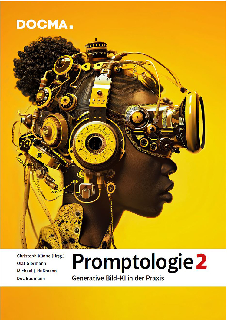 Das bei DOCMA erschiene Buch Promptologie 2 von Christoph Künne (Herausgeber und Autor), Olaf Giermann, Michael J. Hußmann und Doc Baumann schildert Schritt für Technik und Praxis der neuen KI-Werkzeuge zur Bildgenerierung. Klar und verständlich werden Worlkflows dargelegt, Anregungen gegeben und die kreative Verwendung von Prompts in der Praxis beschrieben sowie relevantes Hintergrundwissen vermittelt.