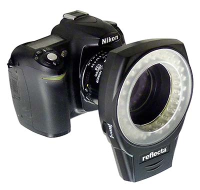 Die neue LED-Ringleuchte von reflecta wiegt nur 150 Gramm und hat eine LED-Lebensdauer von rund 100.000 Stunden und eine lange Betriebsdauer von bis zu 160 Minuten. Sie verfügt über eine Leuchtkraft von etwa 250 bei 1 Meter Abstand. Der Ausleuchtwinkel der dimmbaren LED-Leuchte beträgt 60 Grad. Die Stromversorgung erfolgt über AA-Batterien oder Wechselstrom. Die beiliegenden Gewinde-Adapterringe ermöglichen eine Nutzung der RRL 49 Makro in Kombination mit Objektiven mit 49, 52, 55, 58, 62 und 67mm Filterdurchmesser.