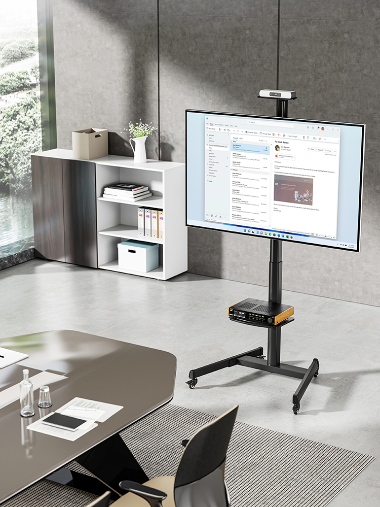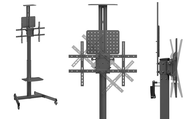 Der mobile Stand richtet sich an Anwenderkreise, die Displays nicht fest installieren möchten, sondern Wert auf flexible Positionierung, ergonomische Anpassung und eine aufgeräumte Integration von Zubehör legen.