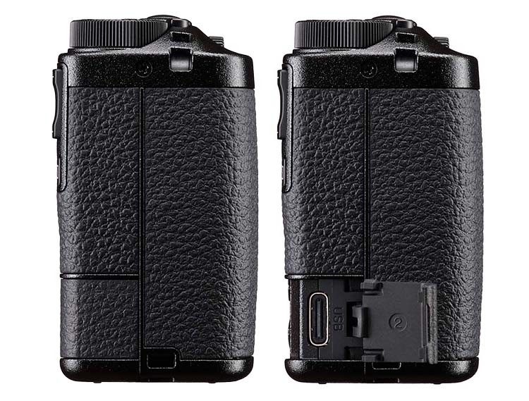 Linke Seitenansicht der Ricoh GR IV mit geschlossener und geöffneter USB-Anschlußklappe.
