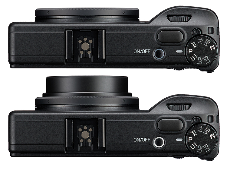 Die Ricoh GR IV Monochrome mit eingefahrenem und ausgefahrenen Objektiv von oben.