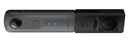 Ricoh Theta V mit Modul für Raumtonwiedergabe.