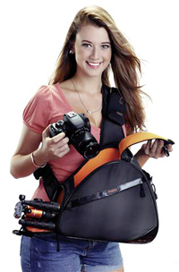 ideal in die Kombination aus Halftertasche und Fotorucksack. Zusätzlich zum Stativ beinhaltet das Set eine gepolsterte, hochwertige Tasche, die außerdem auch eine Kamera plus zwei Objektive und Zubehör aufnehmen kann. Die Tasche eignet sich besonders für kleine DSLR Systeme und spiegellose Kameras. Die wasserfeste, gepolsterte Tasche hat ein kratzund staubfestes Innenfutter, welches das Zubehör optimal schützt. Sie lässt sich auf dem Rücken als Rucksack oder als Halfter seitlich tragen, so dass der Fotograf die Kamera immer im Zugriff hat. Ein schwer zugängliches Fach sichert persönliche Papiere oder Speichermedien. Zudem verfügt die Tasche über einen schmalen Bauchgurt, mit dem sie zusätzlich gesichert werden kann. Der Gurt der Tasche ist für hohen Tragekomfort gepolstert. Er besitzt ein abnehmbares Neopren-Teil für Mobiltelefone. Mittels einer Schnalle kann der Gurt einfach gelöst werden.