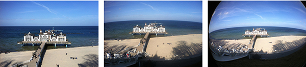 Ohne Olloclip, mit Weitwinkel- (Mitte) und Fisheye- (rechts) Zusatzobjektiv.