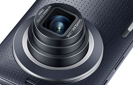 Die Kamera des neuen Galaxy K zoom Smartphones soll laut Samsung professionelle Steuermöglichkeiten für Foto- und Videoaufnahmen bieten. Das eingebaute Zoomobjektiv fährt bei nicht Gebrauch völlig in das flache Gehäuse zurück. Der 20.7 MPix BSI CMOS Sensor verspricht hochwertige Bildqualität. Es ist mit einem optischen Bildstabilisator ausgestattet, um Unschärfe durch Verwackeln zu vermeiden.. Filme können in Full HD aufgenommen werden. Eine integrierte LED-Leuchte sorgt für ausreichende Beleuchtung bei wenig Licht. Zu den Ausstattungsmerkmalen gehören automatische Belichtungs- und Entfernungssteuerung sowie ein ‚Pro Suggest‘ Modus, der fünf Filtereinstellungen umfasst. Ebenso gibt es ein ‚Selfie‘ Alarm, der Anwendern die Aufnahme von Selfies über einen Timer gestattet. Interessant ist auch eine Objekt-Verfolgungsfunktion der AF-Steuerung, die Objekte, die sich bewegen im Fokus halten kann.