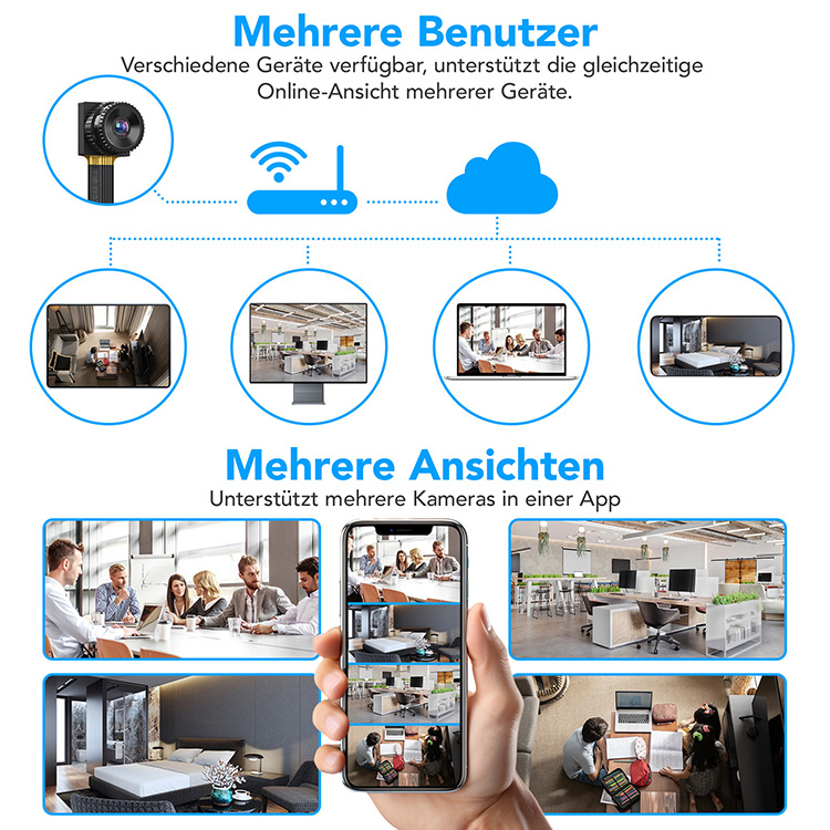 Die Steuerung und Live-Ansicht erfolgen über die kostenlose App ELESION für Android und iOS. Über WLAN lassen sich Einstellungen anpassen und gespeicherte Aufnahmen abrufen, ohne das Kameramodul ausbauen zu müssen. Die Videoübertragung erfolgt per H.265-Kompression, was den Speicherbedarf reduziert. Für die Stromversorgung kann die Kamera wahlweise an ein Netzteil oder an eine Powerbank angeschlossen werden, was den Einsatz an stationären wie mobilen Orten ermöglicht.