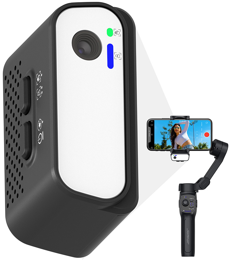 Das magnetische KI-Tracking-Modul erweitert den Stabilisator um automatische Bewegungsverfolgung und ein integriertes Fülllicht mit einstellbarer Farbe in Warm- und Kaltweiß sowie neun Helligkeitsstufen. Die Kombination beider Geräte hält Smartphones horizontal oder vertikal und dreht es auf Wunsch gleichmäßig.