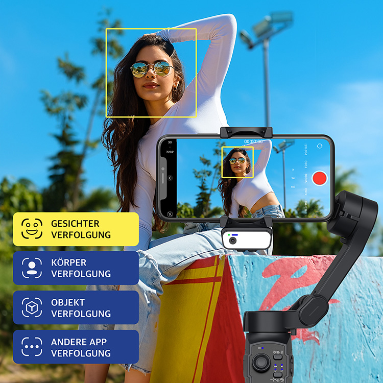 Optional mit Gesichts- und Objektverfolgung: Man benötigt nur den zusätzlichen Tracking-Aufsatz (siehe unten, auch als Set mit Gimbal erhältlich). Schon bleibt man