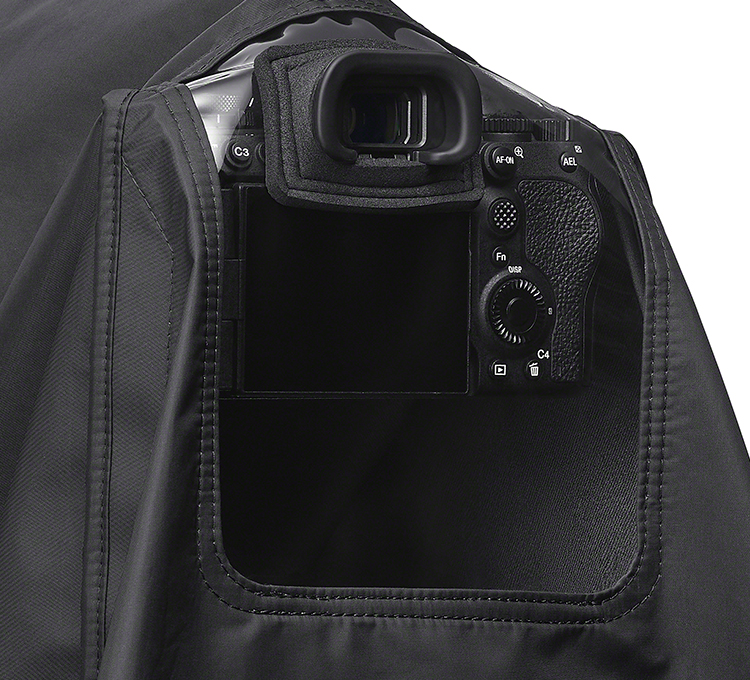 Ein transparentes Sichtfenster erlaubt den freien Blick auf Sucher, Monitor und Bedienelemente kompatibler Sony-Kameras, sodass sich die Ausrüstung auch bei schlechtem Wetter komfortabel bedienen lässt.