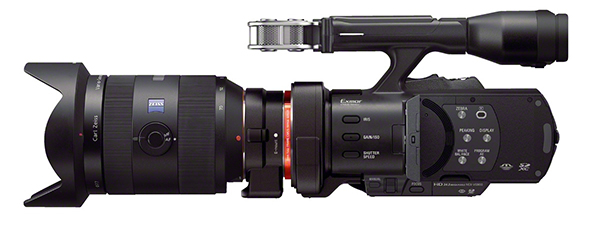 Die Handycam ist kompatibel mit den Wechselobjektiven von Carl-Zeiss und Sony mit E-Mount-Anschluss. Bei der Verwendung eines E-Mount-Objektivs schaltet die Handycam automatisch in den APS-C Modus.
