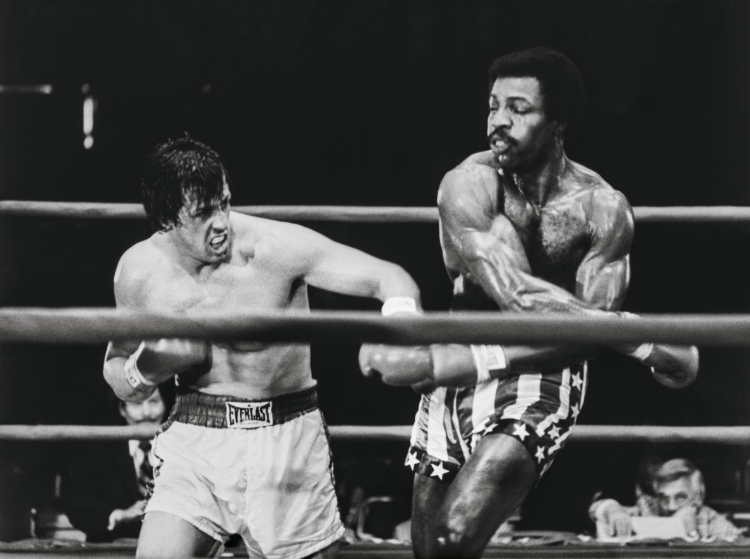 vs. Apollo Creed (Carl Weathers). Stallone: “Carl and I decided to improvise just one small boxing segment — a series of missed blows which I would duck under and then come up and catch the champion with a hook. One improvisational movement caused Carl to miss and he broke his thumb. He was in great pain for the rest of the fight. As a matter of fact, we were both in great pain for the rest of the fight.” copyright Metro-Goldwyn-Mayer Studios