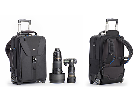 Die neueste Version des Airport TakeOff Rucksack-Trolleys von thinkTANK wiegt etwa 15 Prozent weniger als das Vorgängermodell. Er kann wahlweise als Trolley oder Rucksack genutzt werden. Er ist handgepäck-tauglich und entspricht er den Anforderungen der meisten internationalen Fluggesellschaften. In den TakeOff V2.0 passen zwei DSLR oder Pro DSLR Gehäuse mit mehreren Objektiven bis hin zu einem 2,8/400 mm und Zubehör. Die Reißverschlussslider des Hauptfachs können mit einem Stahlkabel mit Zahlenschloss verschlossen werden. Ebenso kann damit eine Notebooktasche bis 17″ im Vorfach gesichert werden. Das Vorfach verfügt zusätzlich über einen Einschub für ein Tablet bis 10″, ein Fach mit Organizer Funktion und ein samtartig gefüttertes Fach für ein Smartphone bis 6″. Innen auf dem Deckel angebrachte Reißverschlussfächer nehmen Akkus, Speicherkarten, Filter oder andere Kleinteile auf. Auf der Außenseite befindet sich eine Anbringungsmöglichkeit für ein Stativ. Eine zusätzliche Stativaufnahme und Haltegurte für größere Stative sind im Lieferumfang enthalten. Auf der Oberseite des Trolleys ist ein Visitenkartenfach zur schnellen Identifikation untergebracht. Handgriffe an drei Seiten erlauben das leichte Verstauen in Gepäckablagen. Die Räder mit gekapselten Kugellagern haben einen Durchmesser von 80 mm. Sie sind besonders leise und können bei Bedarf – ebenso wie die Radkästen, der Trolleygriff und die vorderen Füße – vom Benutzer selbst ausgetauscht werden. Zum Lieferumfang gehört eine zweifach beschichtete, nahtversiegelte Regenschutzhülle.