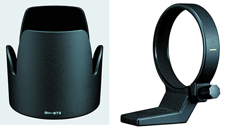 Die zum Lieferumfang gehörende Streulichtblende und die optional erhältliche Stativschelle.