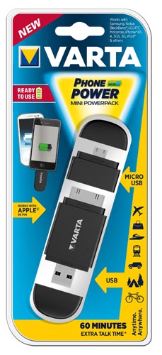 Das ist der Marathonläufer unter den neuen Portable Powerpacks. Über sieben Stunden zusätzliche Energie bietet das auch weg von der nächsten Steckdose. Ausgestattet mit vier AA VARTA High Energy Batterien und Adaptern für Mini USB, Micro USB sowie Apple-Geräte, lädt der mobile Helfer sogar iPad Minis und ist damit der ideale Begleiter auf jeder Geschäftsreise oder Outdoor-Aktivität. Über das mitgelieferte USB-Kabel wird das zu ladende Gerät einfach mit dem Energiespeicher verbunden – LEDs informieren dabei über den Ladezustand.
