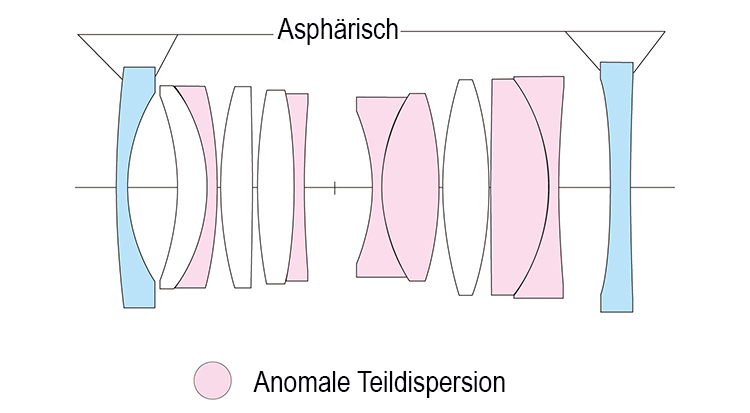Das apochromatische Design zielt darauf ab, Farbsäume auf der Achse und weitere Abbildungsfehler weitgehend zu reduzieren. Die Konstruktion besteht aus zwölf Elementen in acht Gruppen, darunter Spezialgläser und zwei doppelseitige asphärische Linsen. Ein Floating-Mechanismus soll die Bildqualität über den gesamten Fokusbereich stabil halten – von der Naheinstellgrenze von 0,28 Metern bis Unendlich. Die Lichtstärke F2 unterstützt eine flexible Nutzung bei unterschiedlichen Lichtverhältnissen, während die zwölf Lamellen der Blende für eine nahezu runde Öffnung sorgen.