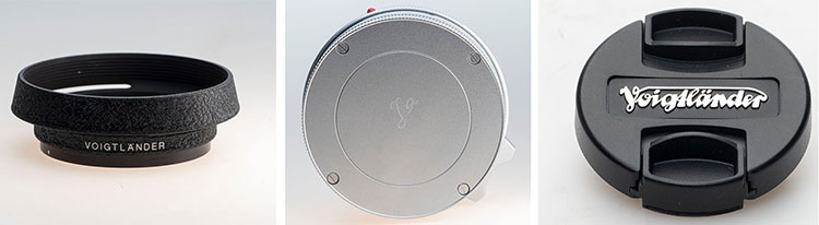 Im Lieferumfang enthalten: Gegenlichtblende, Front- und Rückdeckel des Voigtländer 35mm/1:2,5 Color Skopar II asphärisch VM limited Edition in Silber