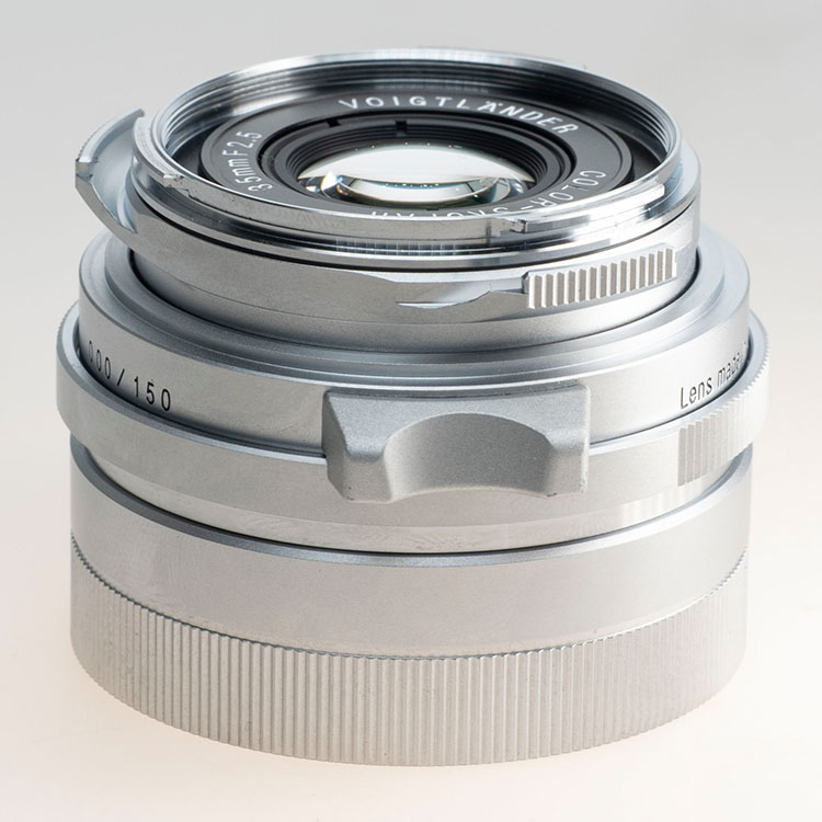 35mm/1:2,5 Color Skopar II asphärisch VM limited Edition in Silber mit dem für Leica Messucherobjektive typischen Schärfenhebel.