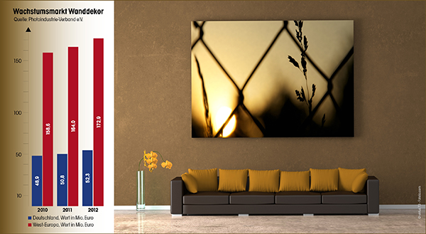 „Der Markt für Wanddekor mit Fotografien hatte im Jahr 2011 ein Volumen in Deutschland von 50,8 Millionen Euro“, beziffert Christoph Thomas den Umsatz dieses Segments. Das Marktforschungsunternehmen Futuresource nennt für den westeuropäischen Markt im Jahr 2011 für die Produktgruppe „Wall-Decor“ eine Stückzahl von 17,6 Millionen Fotowanddekorationen, die einem Umsatzvolumen von 172,9 Millionen Euro entsprechen. Der durchschnittliche Preis eines Fotos auf Leinwand oder Acryl liegen nach Recherchen des Photoindustrie-Verbandes bei 49,40 Euro. Speziell diese Produktgruppe wächst mit derzeit 44 Prozent überproportional stark.