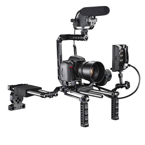 Das System wird in drei Varianten angeboten. Die größte Flexibilität bietet das walimex pro „Mutabilis“ Action-Set. Das Komplett-Set lässt sich entweder auf einem Stativ oder als Cage-Ersatz verwenden oder mit nur wenigen Handgriffen zu einem professionellen Schulter-Rig umbauen. Eine Gegengewichtplatte für zusätzliche Akkus oder Gewichte gehört zum Lieferumfang. Weiteres Zubehör, wie externe Monitore, LED-Leuchten oder Mikrofone, lassen sich über genormte 3/4 Zoll-Gewinde einfach anbringen.