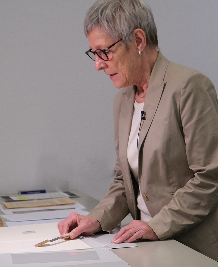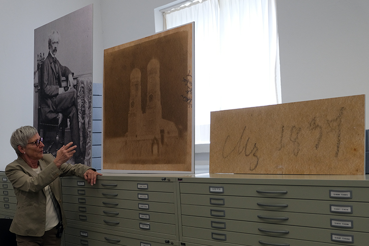 Cornelia Kemp mit dem Repro der ersten Fotografie Deutschlands und der handschriftlichen Datierung. Links ein Foto des Urhebers Franz von Kobell.