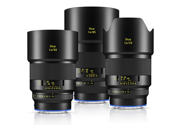 Die komplette Reihe der Zeiss Otus Objektive mit Lichtstärke 1:1,4 und den Brennweiten 50, 85 und 35 Millimeter.